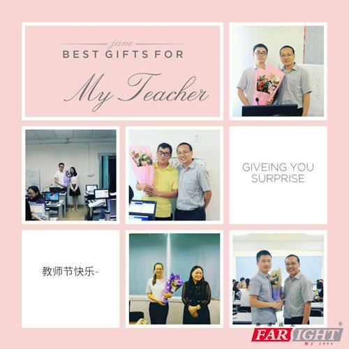 一支粉笔,写尽古往今来; 两袖清风,堪称清正廉明。 三尺讲台,洒青春育英才; 四季耕耘,种桃李满天下。 金秋九月,祝各位老师一一节日快乐! 2017年9月,迎来了我国第33个教师节。每当教师节来临之际,内心总是会充满敬畏之情。教师,一个看似普通的职业,却有着五彩斑斓的色彩。“教师”二字的背后,有艰辛和付出,也有幸福和荣光。讲台上的身影,黑板上的字迹,作为知识的传播者,教师这个职业,足以配得上所有人的敬意和赞美。春蚕到死丝方尽,蜡炬成灰泪始干。一个燃烧自己,照亮世界的人,值得尊重。 今年的教师节,是个周末。9月7日,华清远见成都中心提前为各位老师们送上了教师节的礼物。一束束鲜花整整齐齐地摆放在桌子上,还细心地为每位老师准备了专属卡片,向各位辛勤奉献的老师们送去节日的问候,献上诚挚的祝福。