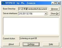 2.配置tftp服务 tftp是一个传输文件的简单协议,它基于UDP协议实现。此协议设计时是进行小文件传输的,因此它不具备通常的FTP的许多功能,只能从文件服务器上获得或写入文件,不能列出目录,不进行认证,只能传输8位数据。 tftp服务分为客户端服务和服务器端服务两种。通常,首先在宿主机上开启tftp服务器端服务,设置好tftp的根目录内容(也就是供客户端下载的文件),然后,在目标板上开启tftp的客户端程序(tftp客户端主要在Bootloader交互环境下运行,几乎所有Bootloader都提供该服务,用于下载操作系统内核和文件系统)。这样,把目标板和宿主机用直连线相连之后,就可以通过tftp协议传输可执行文件。下面分别讲述在Linux下和Windows下的配置方法。 1)Linux下的tftp服务配置 Linux下tftp的服务是由xinetd(还有openbsd-inetd等其他服务)所设定的,默认情况下是处于关闭状态。 首先,要修改tftp的配置文件,开启tftp服务,如下所示: $ vim /etc/xinetd.d/tftp 在这里,主要是要将“disable=yes”改为“disable=no”。另外,通过“server_args”可以看出,tftp服务器端的默认根目录为“/tftpboot”,用户可以根据需要更改为其他目录。 接下来,重启xinetd服务,使刚才的更改生效,如下所示: $ /etc/init.d/xinetd restart 然后,使用命令“netstat -au”以确认tftp服务是否已经开启,如下所示: $ netstat –au | grep tftp 这时,用户就可以把所需的传输文件放到“/tftpboot”目录下,这样,主机上的tftp服务就建立起来。用网络交叉线把目标板和宿主机连起来,并且将其配置成一个网段的地址,再在目标板上启动tftp客户端程序(注意:不同的Bootloader所使用的命令会有所不同,读者可以查看帮助来获得确切的命令名及格式,本书以U-Boot为例讲解),如下所示: # tftp 0x30008000 zImage 可以看到,此处目标板使用的IP为“192.168.1.120”,宿主机使用的IP为“192.168.1.112”,下载到目标板的地址为0x33000000,文件名为“zImage”。 2)Windows 在Windows下配置tftp服务需要使用tftp服务器软件,常见的有Tftpd32,读者可以自行从网上下载。要注意的是,该软件是tftp的服务器端,而目标板上则是tftp的客户端。打开该软件,如图1.3所示。 接下来,用户可以在Settings中配置服务器端的各个选项,如IP地址等,如图1.4所示。 另外,还需要在Browse中选择tftp的服务器端根目录。这时,tftpd会提示用户重启该软件,使修改的参数生效。至此,tftp的服务就配置完毕。此时可以用直连线连接目标机和宿主机,且在目标机上开启tftp服务进行文件传输。
