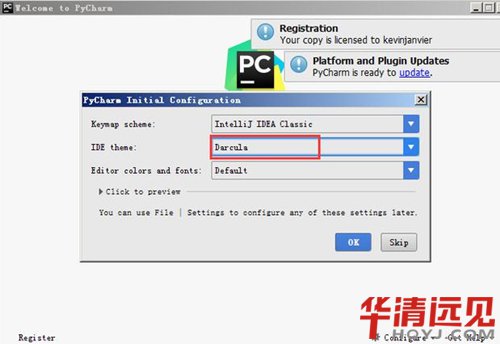 Pycharm成功激活后,会自动跳转到下图界面,我们可以在这里选择IDE主题和编辑区主题:
